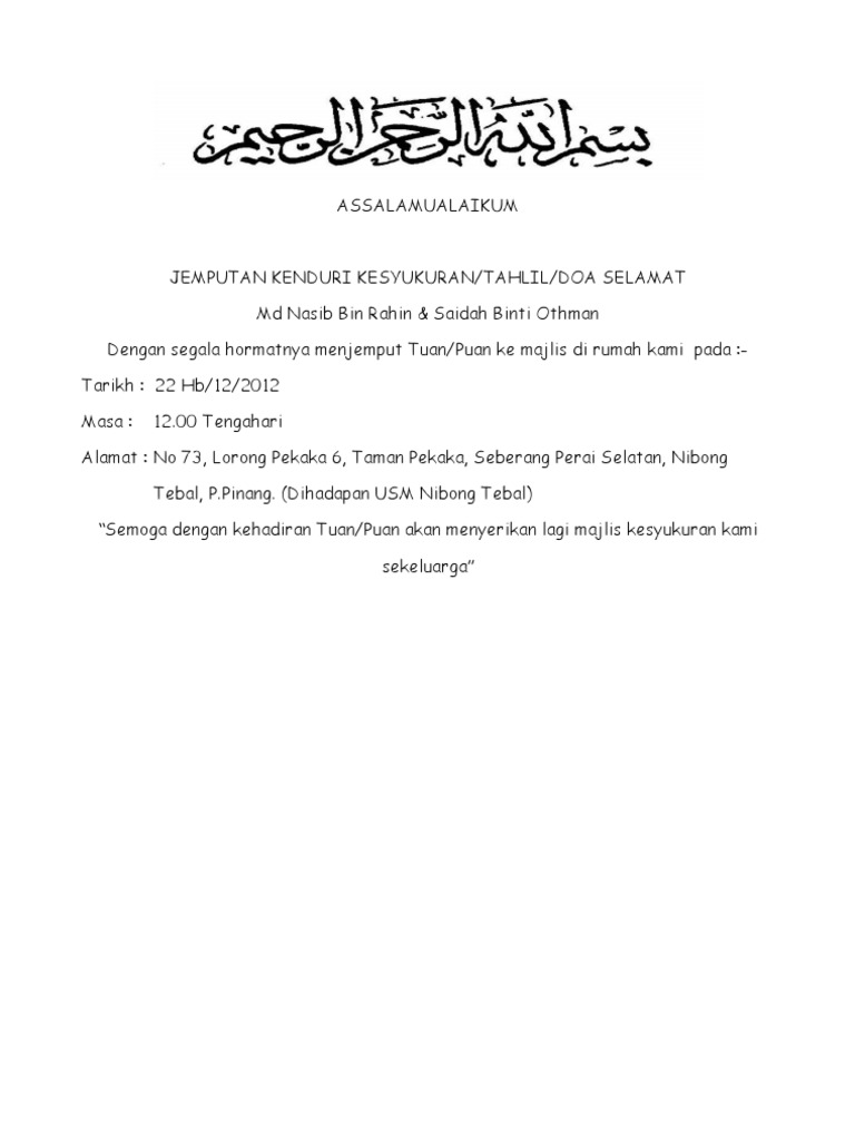 Kad jemputan majlis tahlil dan doa selamat. Ada jemputan kenduri aqiqah dan ada juga jemputan kenduri nak sambut puasa. Kod u002 dengan rasa penuh kesyukuran ke hadrat allah swt dengan segala hormatnya kami nama bapa pengantin.
